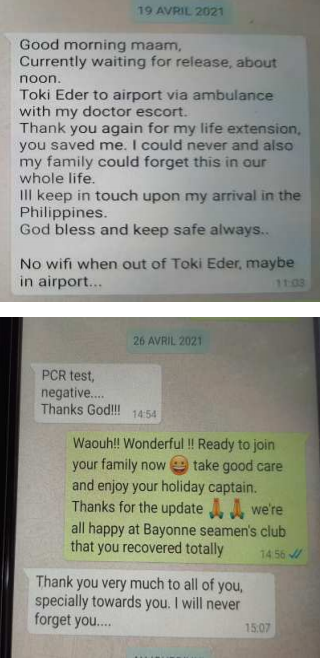 Messages de remerciements du commandant Philippin du Pénélope L dont une partie de l'équipage avait contracté la Covid et débarquée pour une quarantaine obligatoire dans un hôtel spécifique localisé à Pau. Le commandant Philippin, pour sa part, avait été hospitalisé à l'hôpital de Bayonne dans le service de réanimation puis dirigé sur Cambo en rééducation et convalescence.